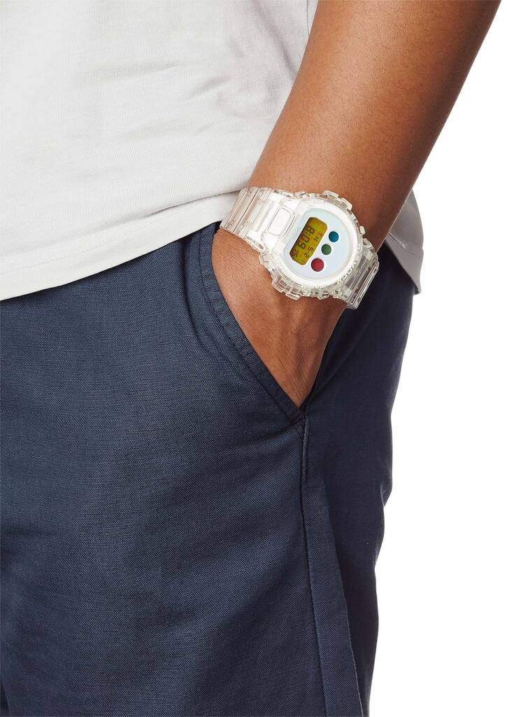 Годинник CASIO DW-6900SP-7ER є моделлю зі стильної колекції японського бренду. Модель випущена на честь 25-річчя з моменту випуску моделі DW-6900. Корпус цієї електронної моделі виконаний з прозорого карбону білого кольору і має форму рифленого кола. Ремінець полімерний, такого ж відтінку. Задня кришка сталева, як і пряжка браслета. Водозахист 200м. Механізм кварцовий 3230, з точністю ходу +/- 15 сек/міс. Джерело ходу (живлення) батарейка CR2016. Циферблат блакитного кольору з жовтим електронним вікном відображає час в арабському стилі. Скло мінералізоване, з поляризаційним шаром. Функції та можливості – будильник, секундомір, таймер, день тижня, число місяця, місяць року і підсвічування.