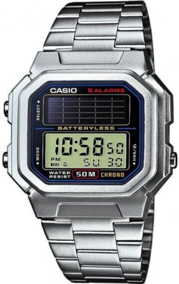 живлення від сонячної батареї, 1/100-с секундомір, таймер, 5 будильників, календар, індикатор заряду батареї, гумовий корпус, ремінець з нержавіючої сталі.
